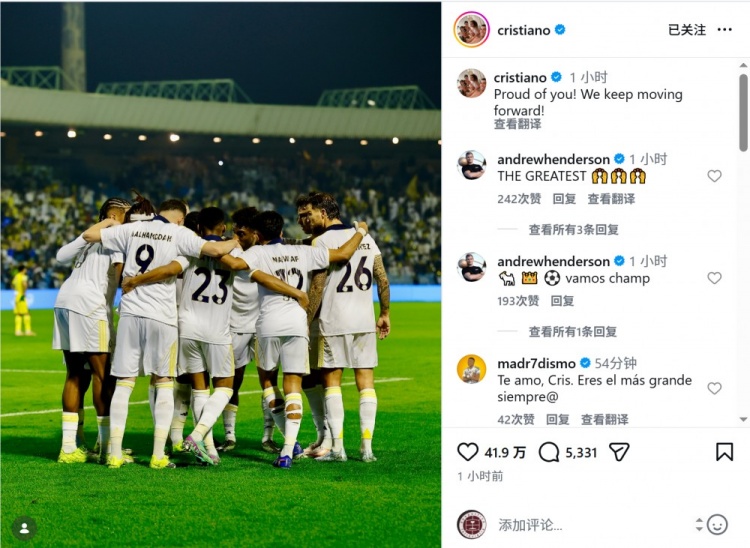 C罗因伤缺席此役,赛后他在社交媒体上晒出队友们庆祝的照片,配文:“为你们感到骄傲,我们继续前进!”